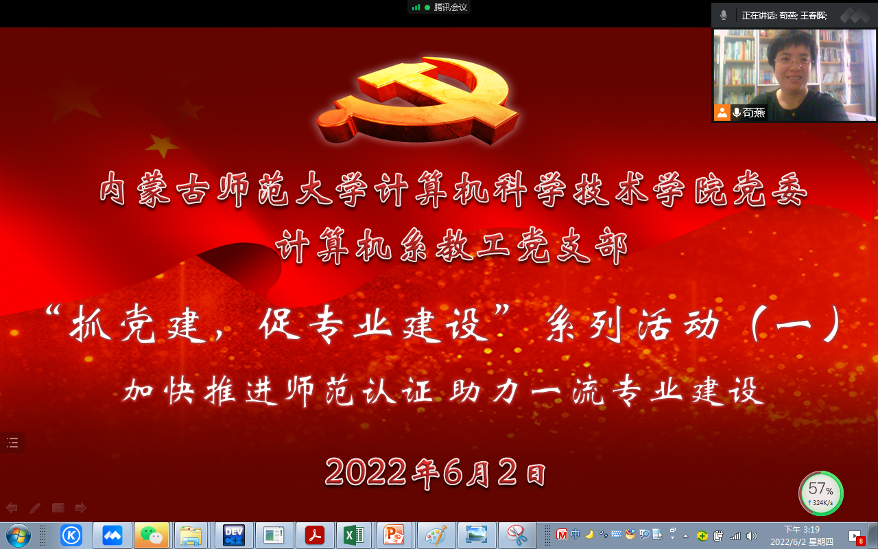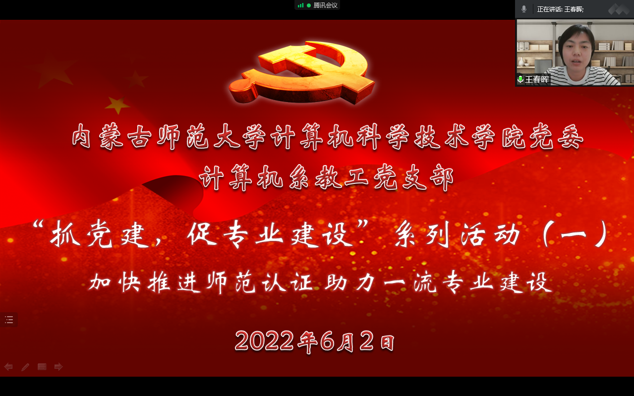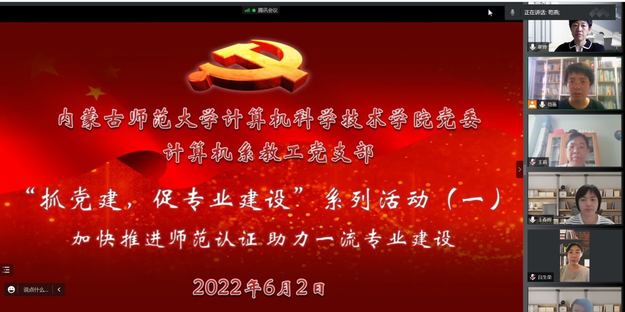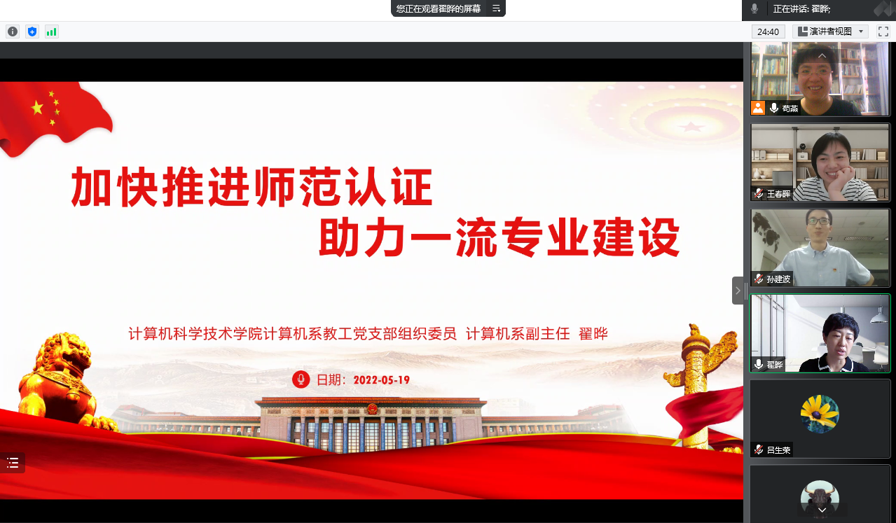 会上,计算机系党支部组织委员、计算机系副主任翟晔围绕德赢官网师范认证工作了详细汇报。首先回顾了德赢官网师范认证的前期准备工作、汇报了目前德赢官网师范认证的进展情况并介绍了下一步的工作计划,最后强调了师范认证作为德赢官网今年的头等要务,需要每一位老师的鼎力支持和全力配合。汇报之后,老师们和系主任围绕师范认证的重要性和目前存在的困难进行了激烈的讨论和交流,大家纷纷表示愿意为了攻克师范认证这个重任贡献自己的一份力量。
