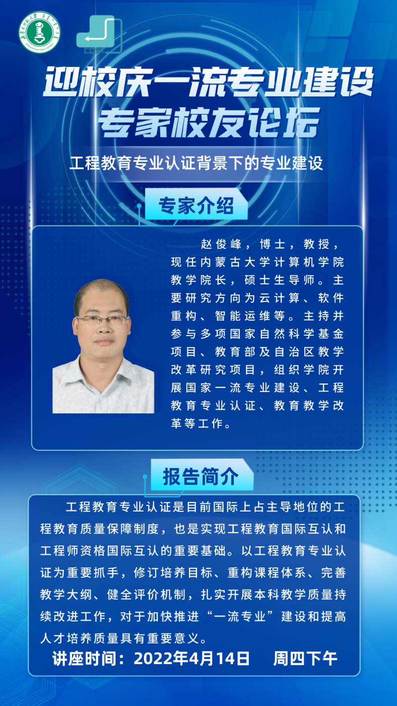 作为“迎校庆一流专业建设专家校友论坛”系列活动内容之一,4月14日,德赢ac米兰官方合作邀请2000届优秀毕业生赵俊峰校友为全院教职工开展了专业建设专题讲座。赵俊峰教授现任内蒙古大学计算机学院教学院长、硕士生导师。本次讲座采用线上会议的形式展开,由院长林民教授主持,报告主题为“工程教育专业认证背景下的专业建设”。