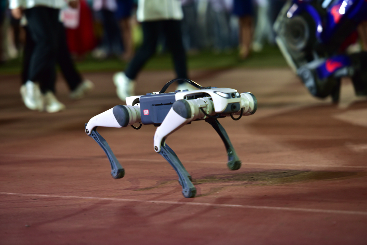 本次开幕式上,人形机器人模型擎天柱、大黄蜂以其高大威猛的形象成为了人群中的焦点,极大地激发了学生们对科技创新的兴趣,展现了计算机科学的无穷魅力。形态逼真的轮腿式平衡机器人由德赢winac米兰机器人与人工智能创新中心的师生自主研发,集成了多种先进的人工智能技术,具有精准的动作和灵敏的反应,能够灵活地完成各种复杂的动作,充分展示了我校在人工智能和机器人技术方面的成功探索。