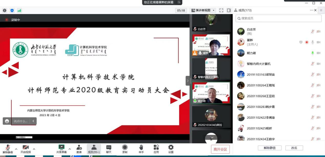 2023年2月4日上午,德赢官网以线上腾讯会议的方式召开了2020级计科师范专业教育实习动员大会。学院院长林民、副院长智敏、计算机系系主任朝力萌、副主任翟晔、副主任王春晖、教育实习指导老师和辅导员参加了会议。