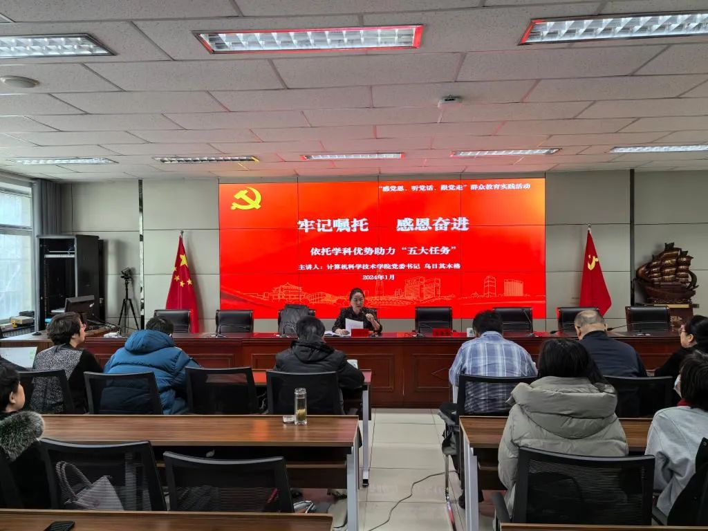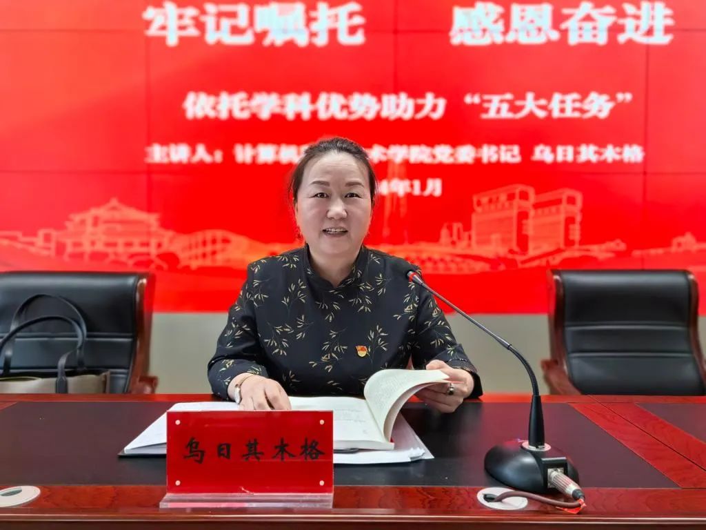 为深入学习贯彻党的二十大精神,深刻领悟习近平新时代中国特色社会主义思想的真理力量和实践伟力,特别是学懂弄通做实这一重要思想的“内蒙古篇”和“民族篇”,全面落实习近平总书记交给内蒙古的五大任务和全方位建设“模范自治区”两件大事,进一步深化主题教育成果,按照《德赢winac米兰“感党恩、听党话、跟党走”群众教育实践活动实施方案》要求,1月9日德赢ac米兰官方合作党委书记乌日其木格为学院全体教职工讲授主题为《牢记嘱托,感恩奋进,依托学科优势助力“五大任务”》的专题党课。