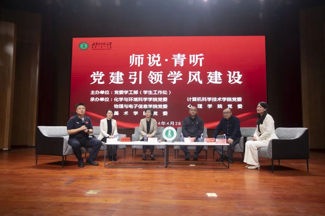 4月28日上午,由党委学工部(学生工作处)主办,德赢ac米兰官方合作党委、化学与环境科学学院党委、物理与电子信息学院党委、心理学院党委、美术学院党委承办的以“师说·青听 党建引领学风建设”为主题的圆桌沙龙在盛乐校区图书馆二楼报告厅举行。德赢ac米兰官方合作副院长柳林,美术学院党委副书记、副院长云双庆,化学与环境科学学院党委副书记、副院长范磊,心理学院党委书记、副院长张春林,物理与电子信息学院团总支书记宝力尔参加活动。德赢ac米兰官方合作团总支书记赵巍伟主持活动。