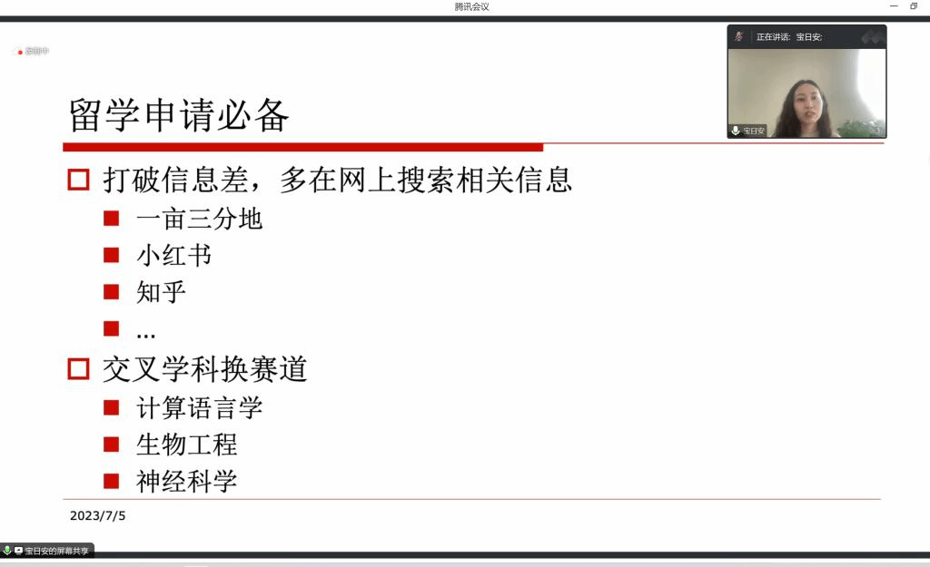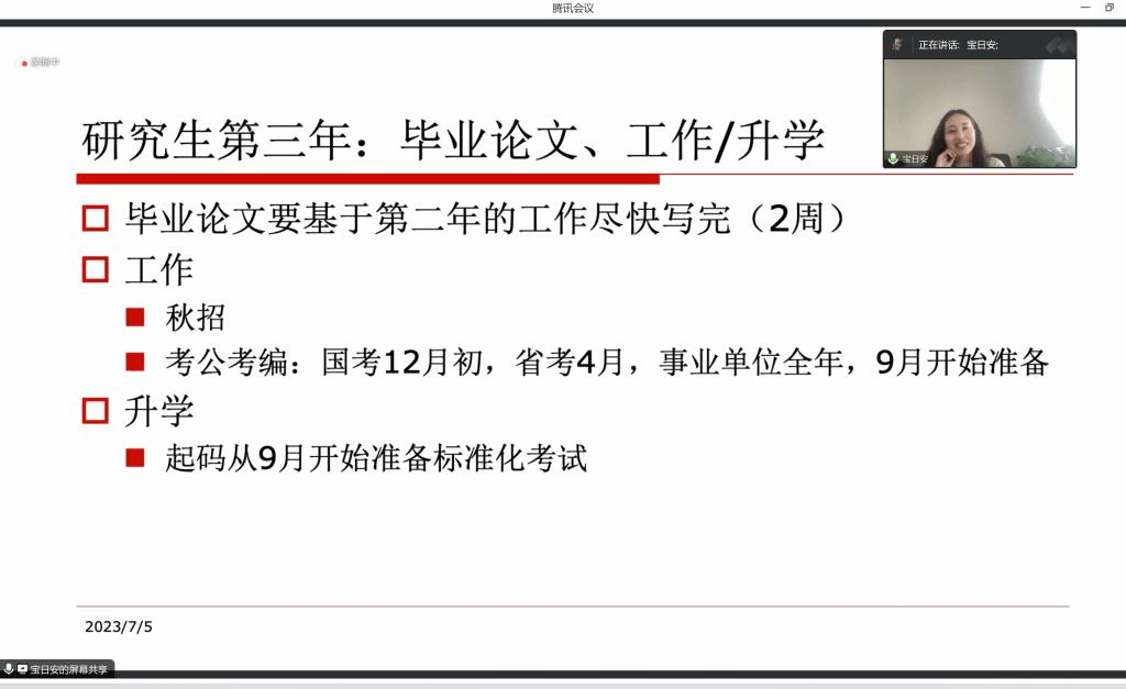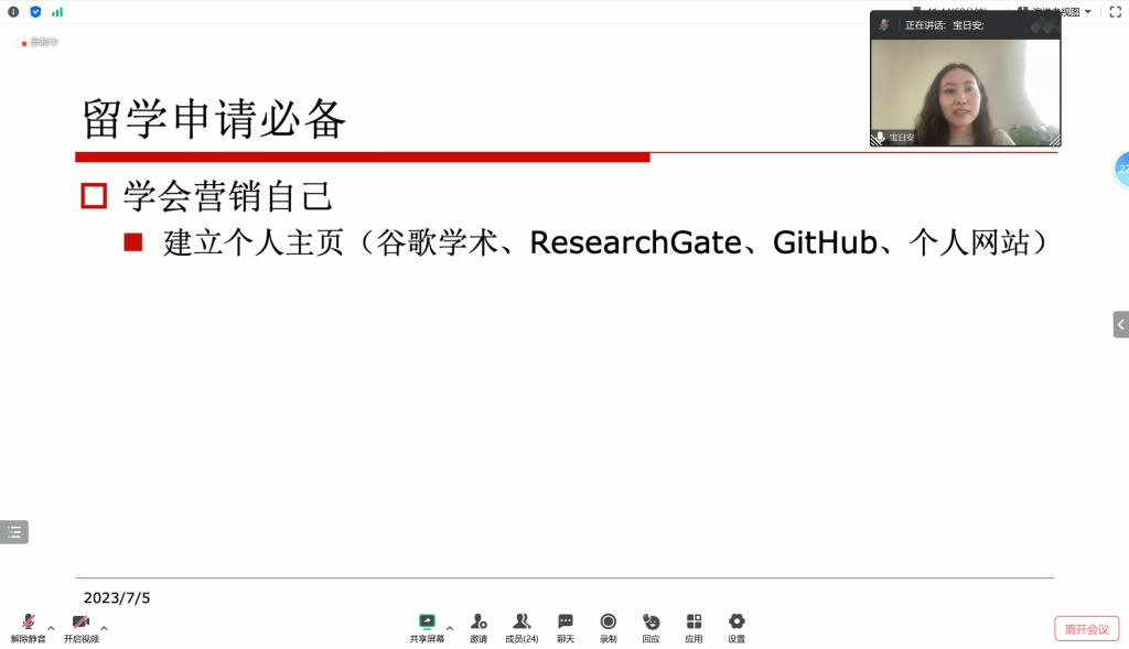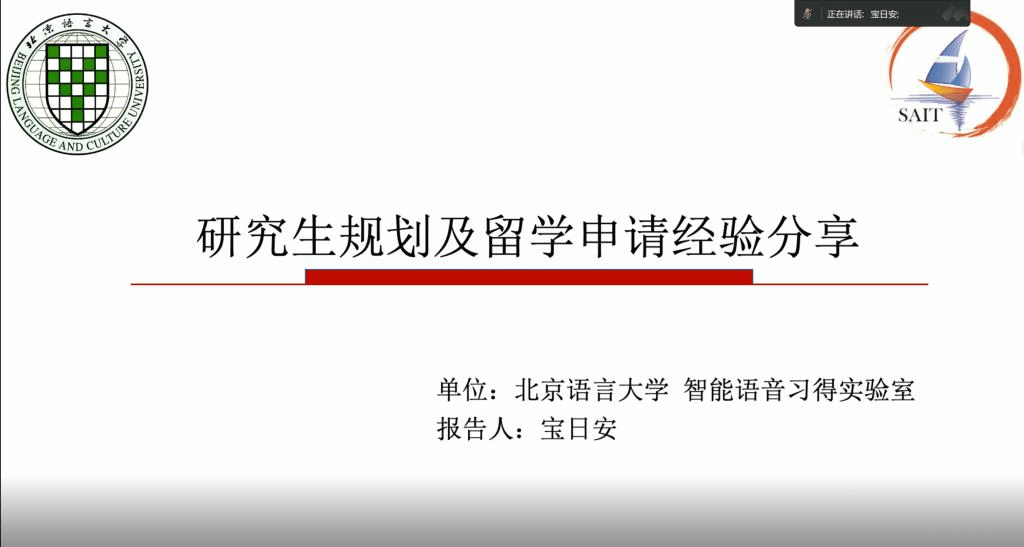 为指导德赢ac米兰官方合作在读研究生了解留学申请的流程,帮助学生高效利用在校的三年时间,2023年7月5日下午,学院白双成老师邀请北京语言大学语言智能与技术专业的毕业生宝日安开展了“研究生规划及留学申请经验分享”线上主题讲座,学院部分研究生和本科生积极参与。